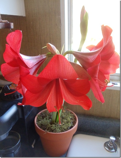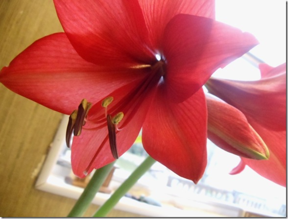I’ve been saving up this photo project as a special treat for all of you, my Dear Readers! Ever since Dec. 23rd, when my DH gave me this amaryllis plant, I’ve been taking a photo every day. Rebekah, my daughter , was just telling me this morning how tired she was getting of the drab winter skies..and how it made everything outside look dull and gray. I have to say, she was right!